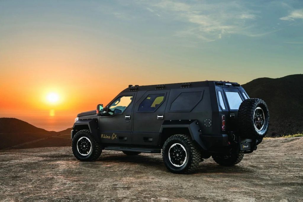 На заводі Rancho Cucamonga, що належить компанії US Specialty Vehicles (USSV), розібрали двовісний пікап Ford F450 Super Duty, прибрали вісь, додали сталевий корпус 20 калібру, систему гідравлічної підвіски і ще один набір дверей – так з’явився Rhino GX. Автомобіль є чимось середнім між Cadillac Escalade і броньованим транспортом, на якому може прибути група спецназу.