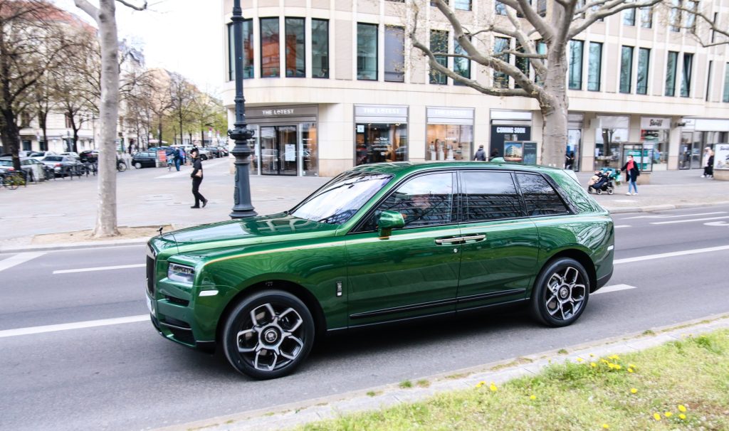 Цей Rolls-Royce Cullinan Black Badge вартує мінімум 700 000 доларів. Від стандартного позашляховика він вирізняється ексклюзивним декором на кузові, особливим внутрішнім оздобленням і 22-дюймовими дисками. Конкретно у цього авто – ще й цікаве зелене забарвлення Dark Emerald.
