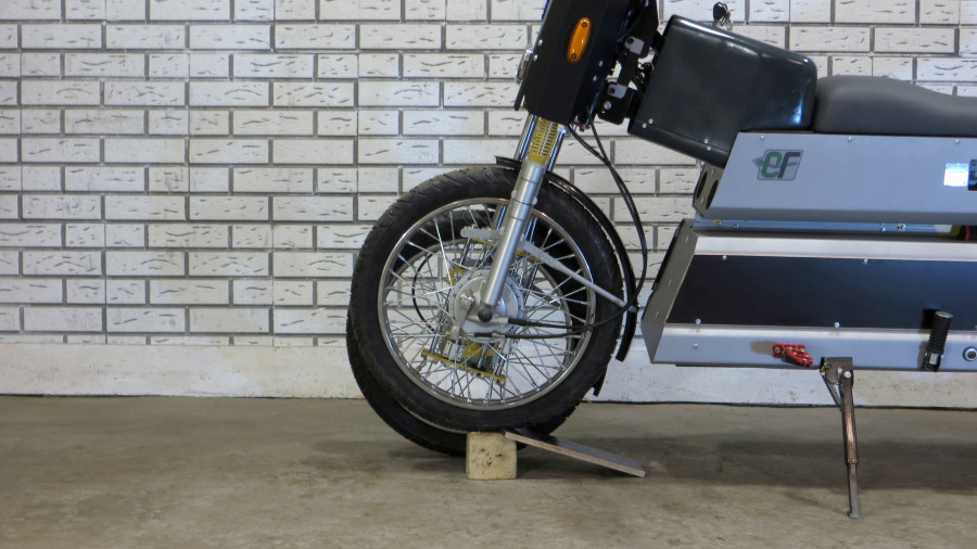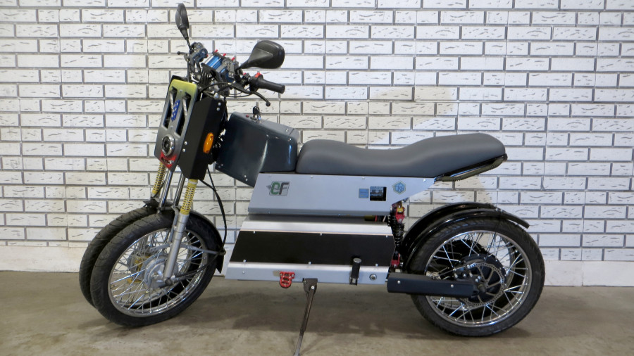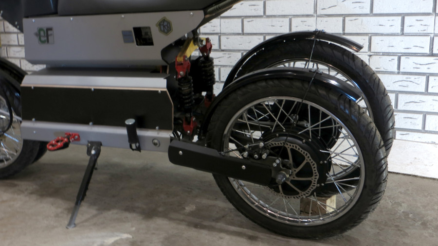Двигуни байка потужністю по 3кВт живляться від двох акумуляторів. За словами розробника, запас ходу становить близько 100 км.