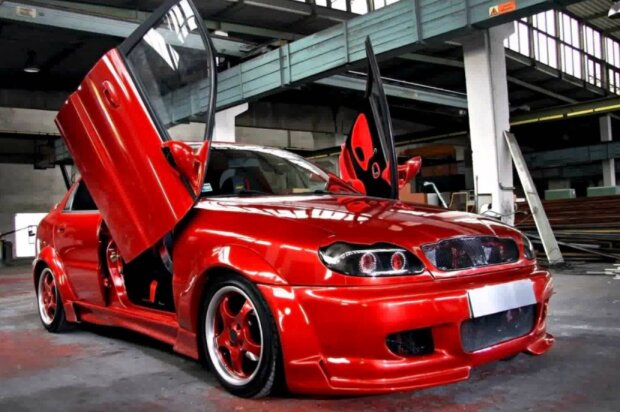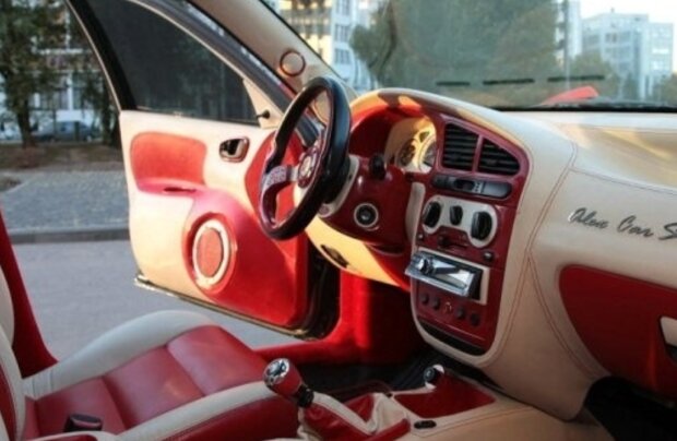 Шикарний червоний «Ланос» оснастили спортивним обважуванням з оригінальними бамперами, бічною спідницею, завдяки якій седан почав нагадувати авто, а також встановили легкосплавні диски в колір кузова.