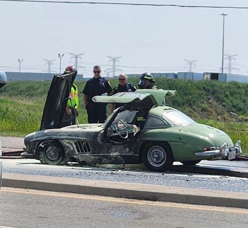 ДТП сталася фактично на рівному місці — Mercedes 300SL Gullwing загорівся під час руху автомагістраллю. На щастя, водій і пасажир змогли швидко покинути авто.