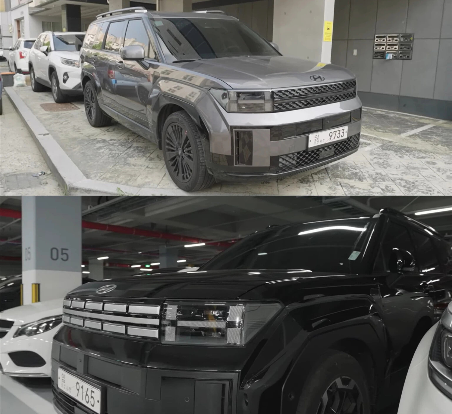 Друге відео демонструє Hyundai Santa Fe у чорному кольорі. Тут радіаторні грати отримали більш брутальне виконання. До речі, колеса встановлені інші – на 18 дюймів. Швидше за все це початковий варіант кросовера. В усьому іншому обидва автомобілі мають схожий стиль виконання.