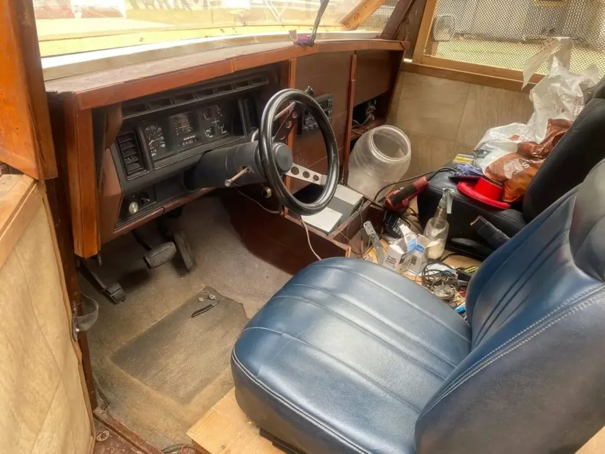 У салоні зі справжнього тільки сидіння, рульове колесо, ручне гальмо та панель приладів. Все решта дерев’яне. Дверні панелі зсередини затягнуті чимось схожим на лінолеум. На місці бокового скла — дрібна сітка.