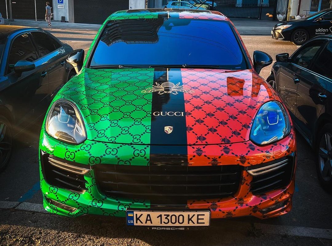 До речі, Porsche Cayenne досить незвичний – у нього двоколірне забарвлення, а також візерунки та логотипи Gucci на кузові.
