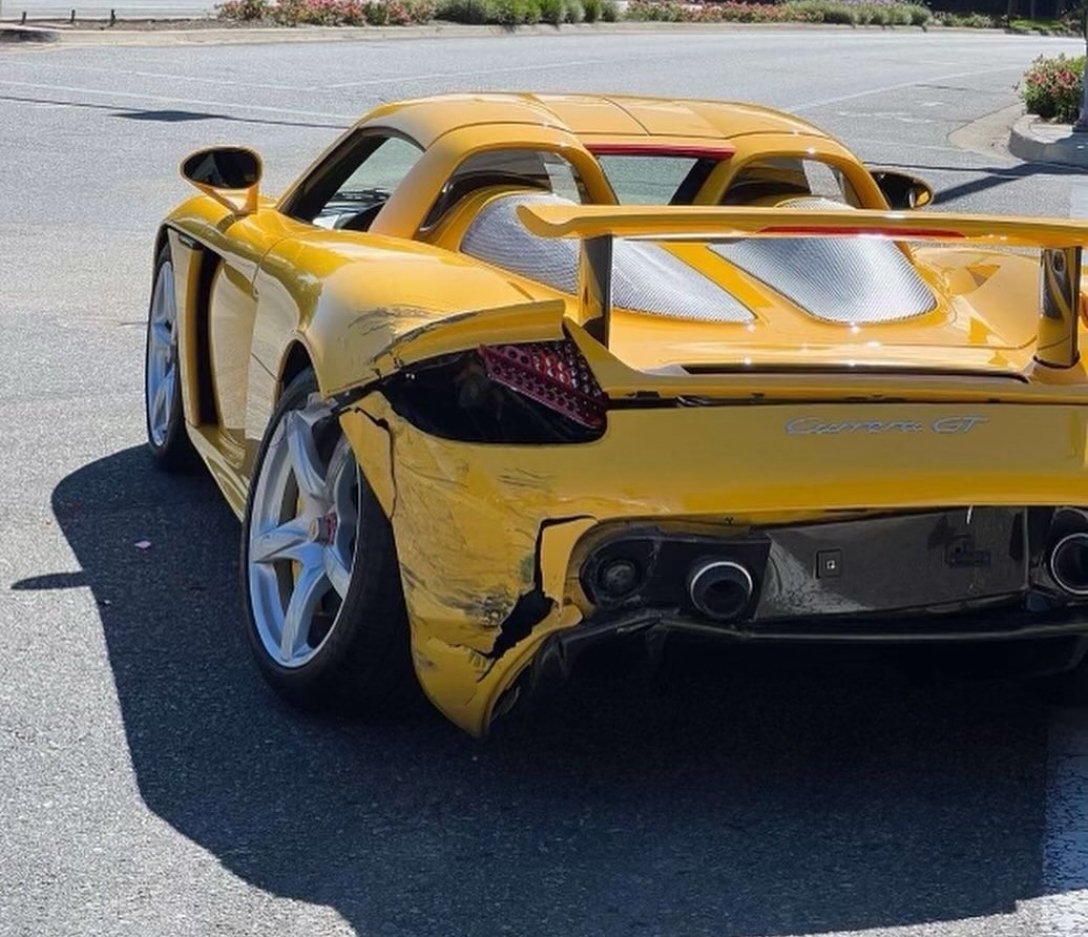 Аварія сталася в містечку Калабасас (штат Каліфорнія). Судячи з фото, Porsche Carrera GT занесло і він врізався задньою частиною.