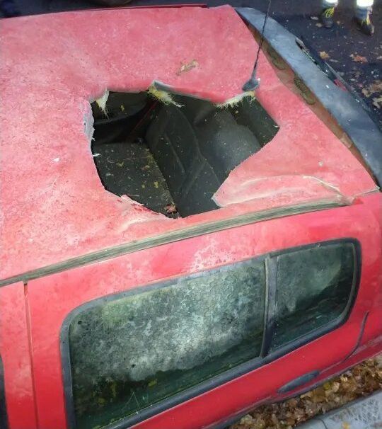 У результаті Renault Clio залишився з 50-сантиметровою дірою в даху та розбитим вікном. Місцеві мешканці викликали копів.