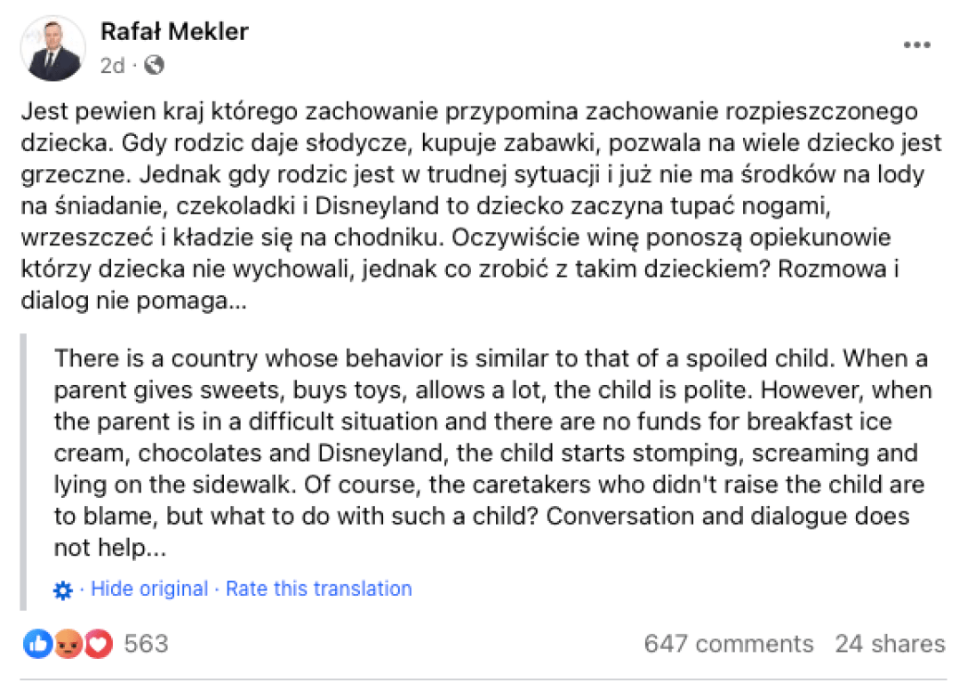 «Є країна, поведінка якої схожа на поведінку розпещеної дитини, — написав він у Facebook. — Коли батько дарує солодощі, купує іграшки, багато чого дозволяє, дитина ввічлива. Але, коли батько перебуває у складній ситуації, і немає коштів, щоб купувати на сніданок морозиво, шоколад і Disneyland, дитина починає тупотіти, кричати та валятися на тротуарі».