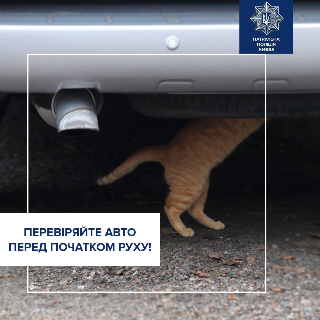 «Радимо перед тим, як завести двигун — постукайте по капоту та перевірте зазначені місця. Врахуйте, що лякливі котики можуть сховатися ще глибше», — пише поліція.