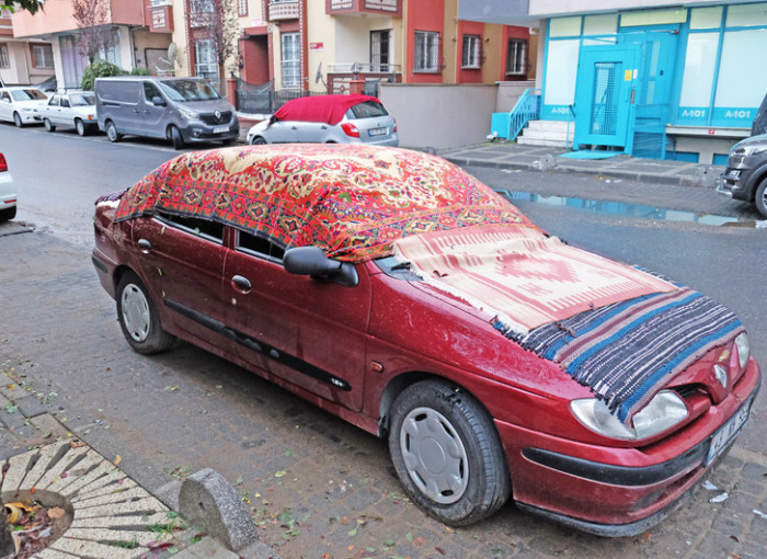 Однією з практичних причин, через які турецькі водії накривають свої машини килимами, є захист від пилу, сонячних променів, а також дощу з градом, який у деяких регіонах країни є звичайним явищем.