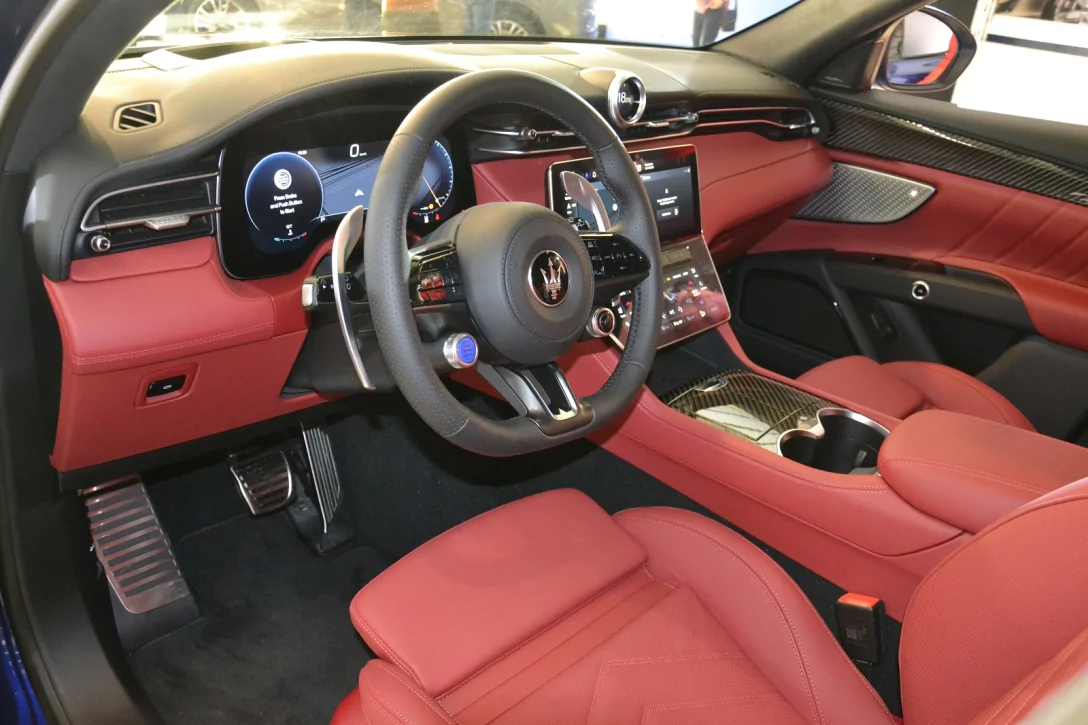 Новий Maserati Grecale вирізняється плавними формами, з якими контрастує фірмова «паща» решітки радіатора. Салон оздоблений дорогою шкірою, а на центральній панелі два дисплеї мультимедійної системи поєднуються із класичним годинником. Кросовер просторий і має місткий 535-літровий багажник.