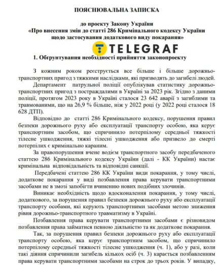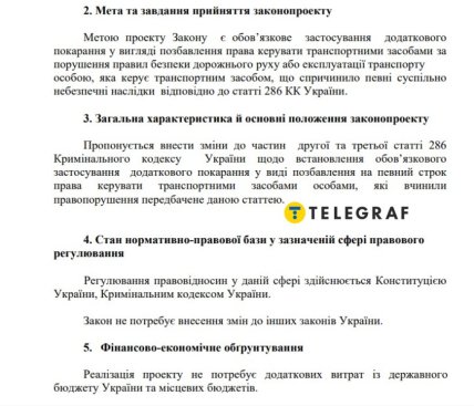«Телеграф» проаналізував основні положення документа та можливі наслідки його прийняття для українських автомобілістів. Ініціатори законопроєкту — депутати IX скликання Володимир Мороз та Валерій Гнатенко — у пояснювальній записці зазначають, що прийняття проєкту дозволить запобігти вчиненню нових правопорушеня щодо безпеки дорожнього руху або експлуатації транспорту особами, які керують транспортними засобами. Також, на їхню думку, суспільно небезпечні наслідки, які настали, будуть співмірними з призначеним розміром додаткового покарання.