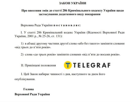 Зараз за порушення ПДР, що спричинило потерпілому середньої тяжкості тілесне ушкодження, або якщо такі діяння спричинили загибель кількох осіб, то винного у вчиненні аварії позбавляють права керувати ТЗ на строк до 3 років. А якщо такі діяння спричинили смерть людини або заподіяли їй тяжке тілесне ушкодження, то винуватця можуть позбавити водійського посвідчення на строк до 3 років або без такого. Суди, розглядаючи кримінальні справи за статтею 286 ККУ, часто ухвалюють вирок без позбавлення прав. Це суперечить співмірності наслідків ДТП та покарання за його вчинення, впевнені народні обранці.