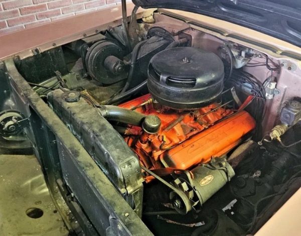Під масивним капотом автомобіля прихований класичний двигун V8 — символ американської потужності 50-х років. Попри тривалий простій, підкапотний простір виглядає ідеально: на вузлах і агрегатах збереглися навіть заводські маркування та паперові бірки.
