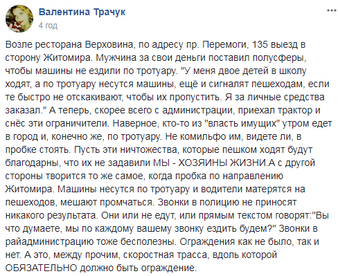 Она рассказала, что возле ресторана «Верховина» на проспекте Победы, 135, в сторону Житомира, мужчина за свой счет установил на тротуаре полусферы.