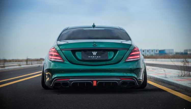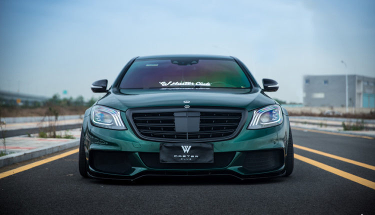 У свою чергу задні крила виконані з металу, а кузов машини пофарбували в зелений колір. Тюнінгований Mercedes-Benz S-Class відрізняється дуже низькою посадкою і наявністю авторської решітки радіатора, виконаної в чорному кольорі.